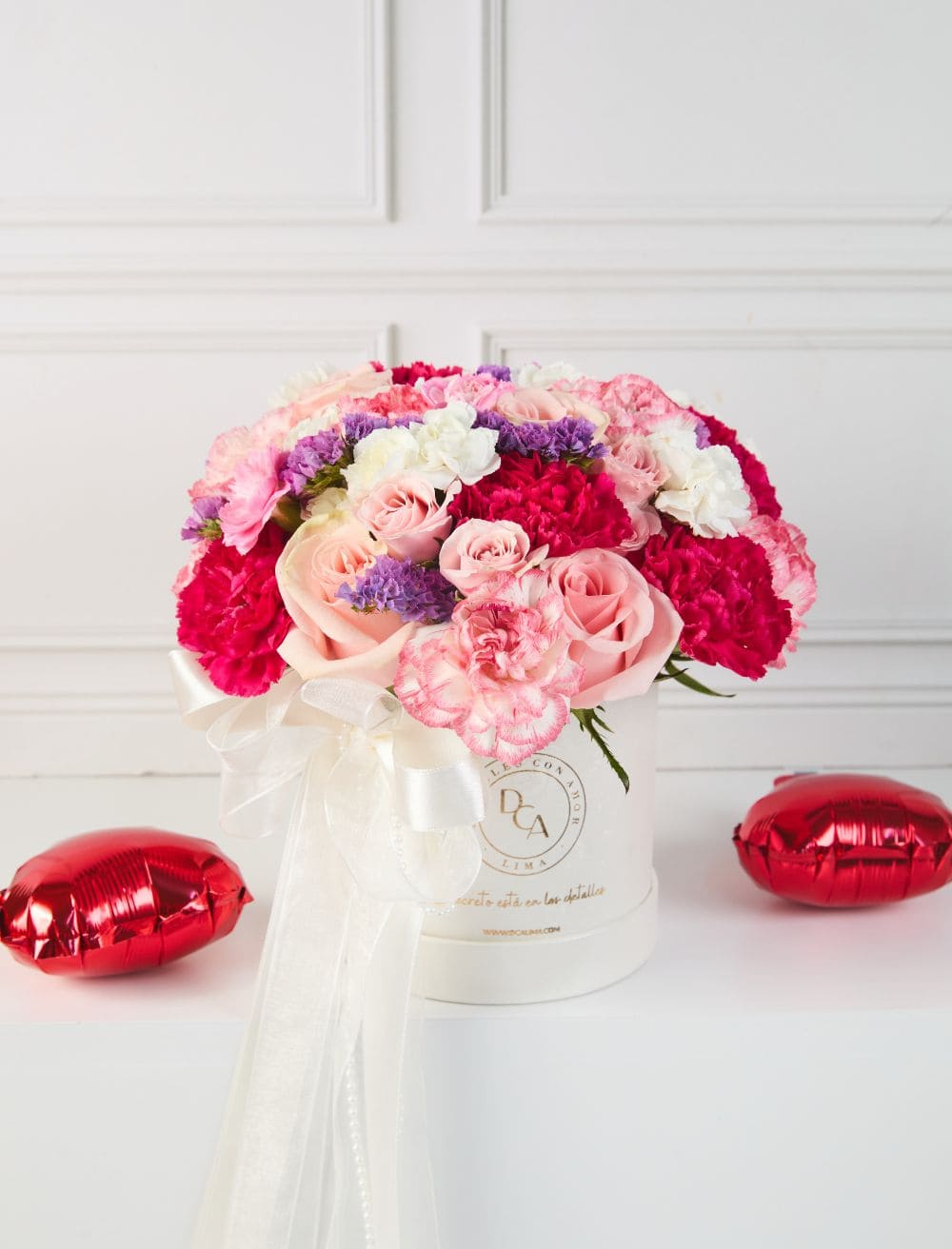 El Box Petit Mix Claveles San Valentín destaca por su armoniosa combinación de claveles importados y rosas en tonos fucsia, rosa y blanco. Presentado en nuestro icónico box blanco con detalles dorados, este arreglo es perfecto para quienes buscan un detalle lleno de vida, frescura y elegancia. Es una pieza floral que cautiva por su delicado aroma, ideal para iluminar el día de esa persona especial.