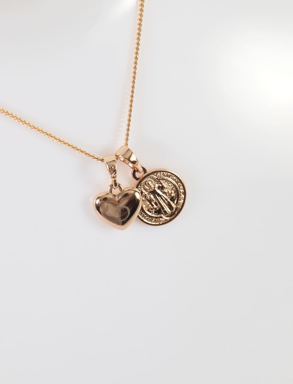 Este collar enchapado en oro de 18K combina un dije de corazón con un pequeño relicario rectangular que guarda la imagen de la Virgen Milagrosa, símbolo de protección y amor divino.