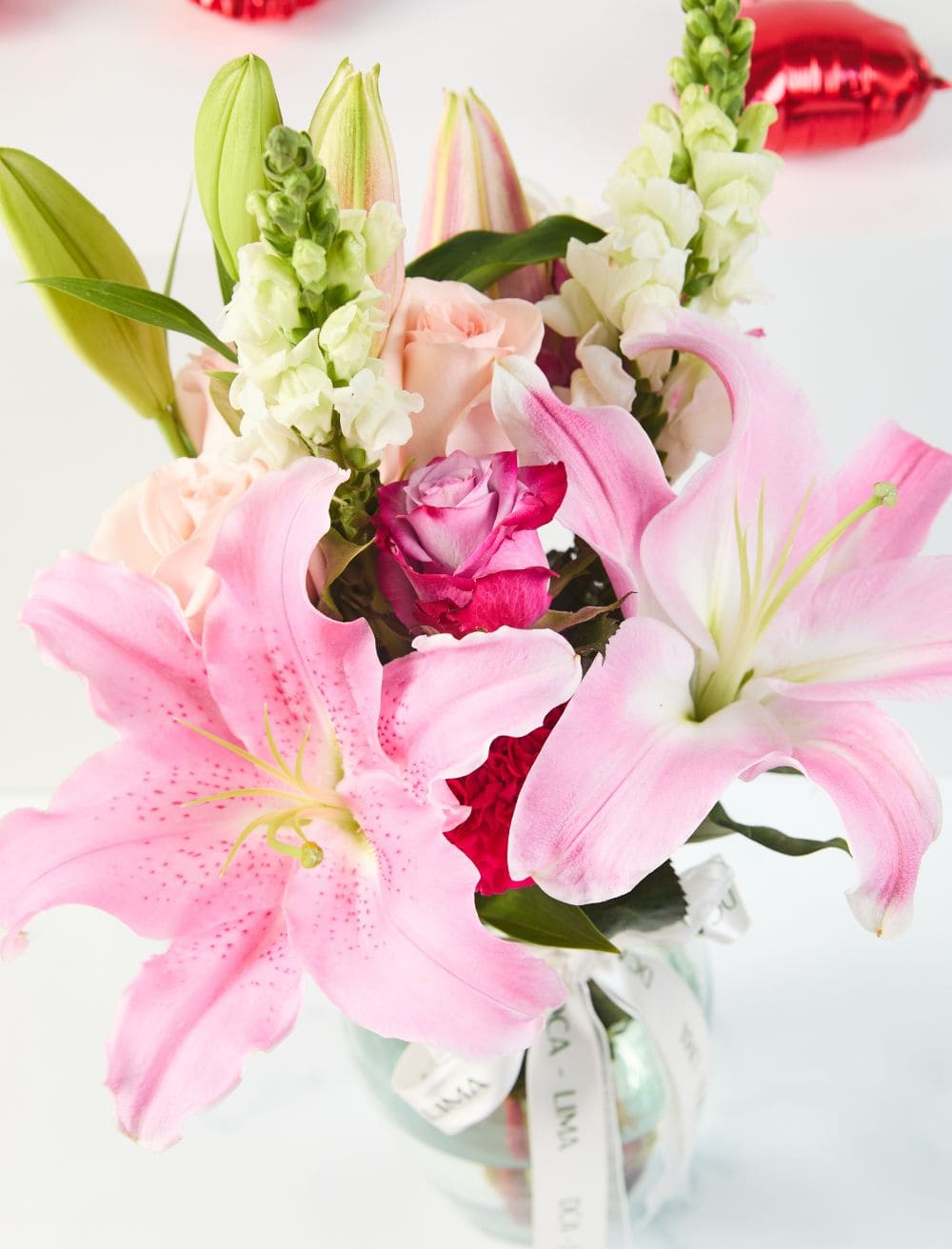 Un regalo que cautiva por su aroma y su imponente presencia. El Florero Lirios Rosé San Valentín es la máxima expresión de la elegancia primaveral, diseñado para quienes buscan un detalle natural que transforme cualquier espacio. Este arreglo combina la majestuosidad de los lirios rosados y rosas en tonos lila, creando una composición armoniosa y sofisticada. Presentado en un florero de cristal.