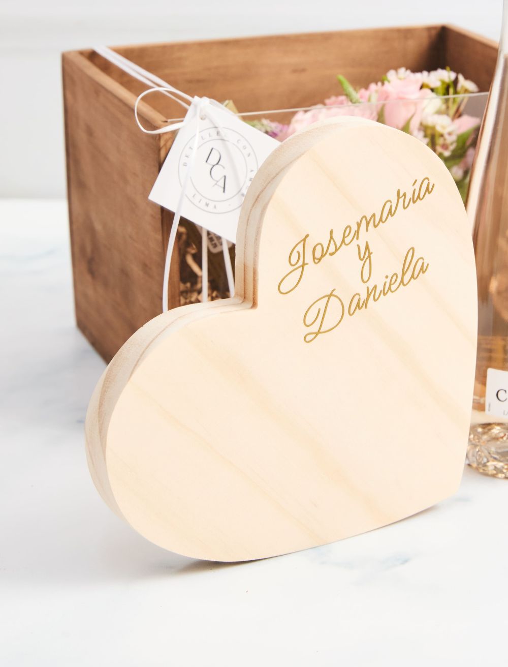 - 1 Tabla de pino en forma de corazón con nombres a vinil